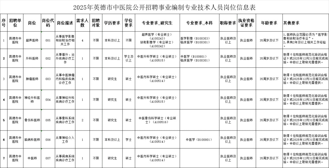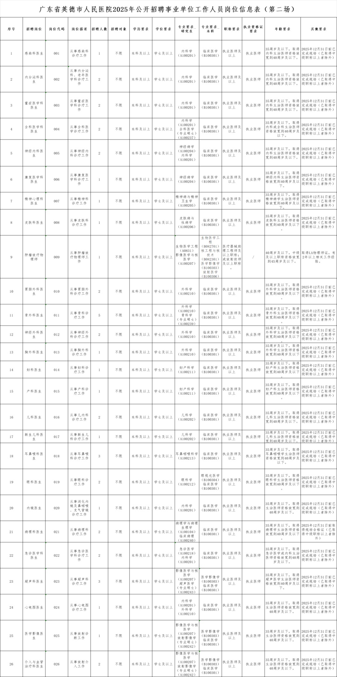 为进一步加强 医疗卫生人才队伍建设 提升基层医疗服务能力 英德市人民医院、市中医 面向社会公开招聘 医疗卫生专业技术人员共56名 英德市人民医院 公开招聘事业单位工作人员 为贯彻落实全省高质量发展大会和省委省政府提出实施“百万英才汇南粤”行动计划有关要求,根据《广东省事业单位公开招聘人员办法》(第301号)有关规定,结合业务发展的实际需要,决定面向社会公开招聘事业编制专业技术人员45名。为确保招聘工作公开、公平、公正地进行,具体公告如下: 一、单位简介 广东省英德市人民医院始建于1949年,是...